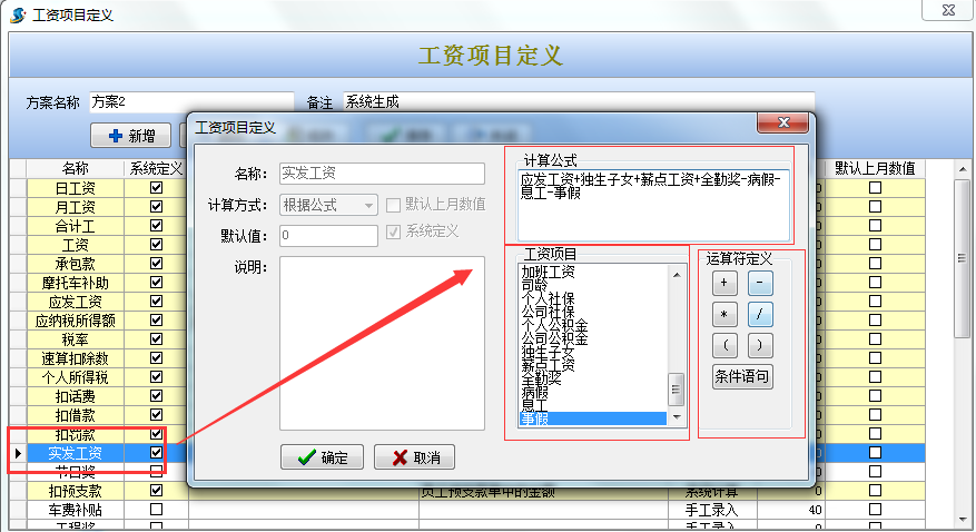 雙擊選擇實發(fā)工資,通過工資項目和運算符定義編輯計算公式(運算字符一定要用鼠標(biāo)點擊下圖運算符定義選擇,不能用鍵盤直接輸入)