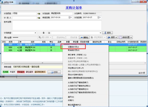 在彈出的待審核單據(jù)à材料計劃單,點擊修改按鈕,彈出材料計劃單,在材料行位置右擊鼠標,對特定材料設置詢價員,操作如下