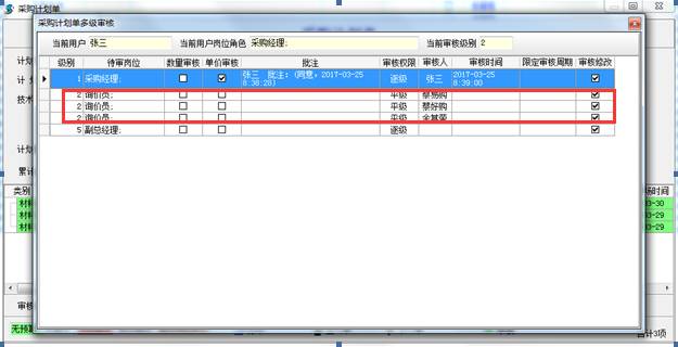 這樣你會看到在原先的審核級別中會自動插入了3個詢價員的平級審核,3個詢價員會同時收到審核提醒信息。
