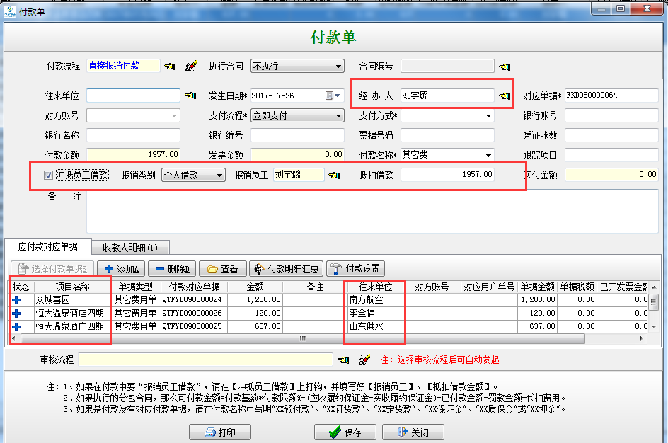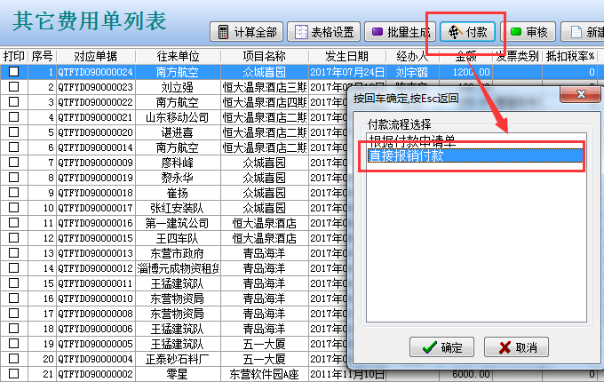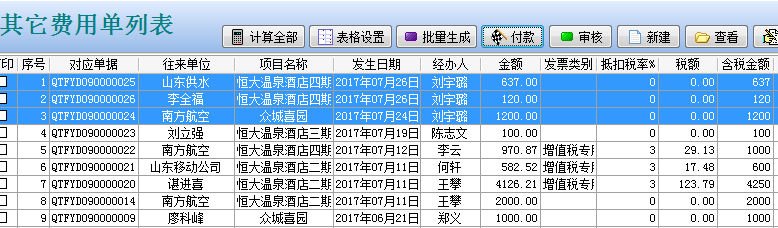 工程項目管理軟件中如果某個員工在多個項目任職,又有多個往來單位都產生業務往來,都要進行報銷付款(沒有對應合同的前提下),按住ctrl鍵選擇待付款的單據(需單據的經辦人是相同的)