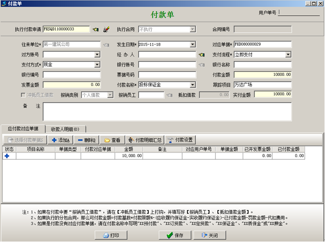 交納投標(biāo)保證金時(shí)填寫“付款申請(qǐng)單”或者“付款單”,(如果填寫的是付款申請(qǐng)單則在付款申請(qǐng)單審核通過(guò)之后進(jìn)行付款),如圖: