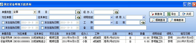 每日的信息也將在系統(tǒng)中自動匯總,形成固定設(shè)備明細萬能查詢,可以說是固定設(shè)備使用的總賬。