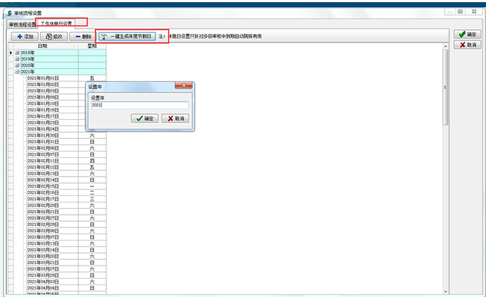 在金石工程項目管理軟件審核流程設置模塊,可以一鍵添加本年度法定節假日和休息日。