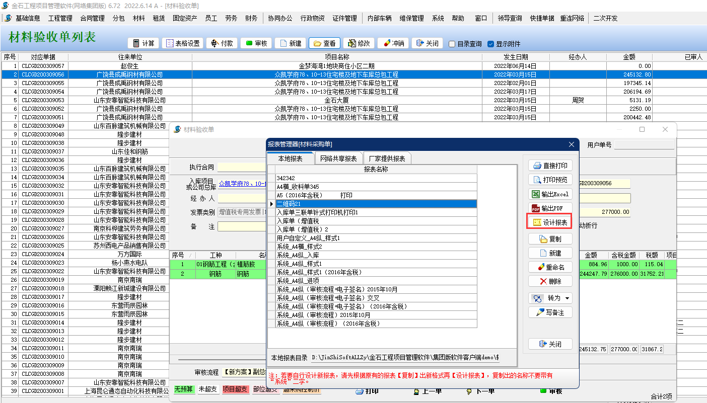 1、打開材料驗收單列表,找到單據點擊查看后點擊打印按鈕。找到常用報表點擊設計報表。