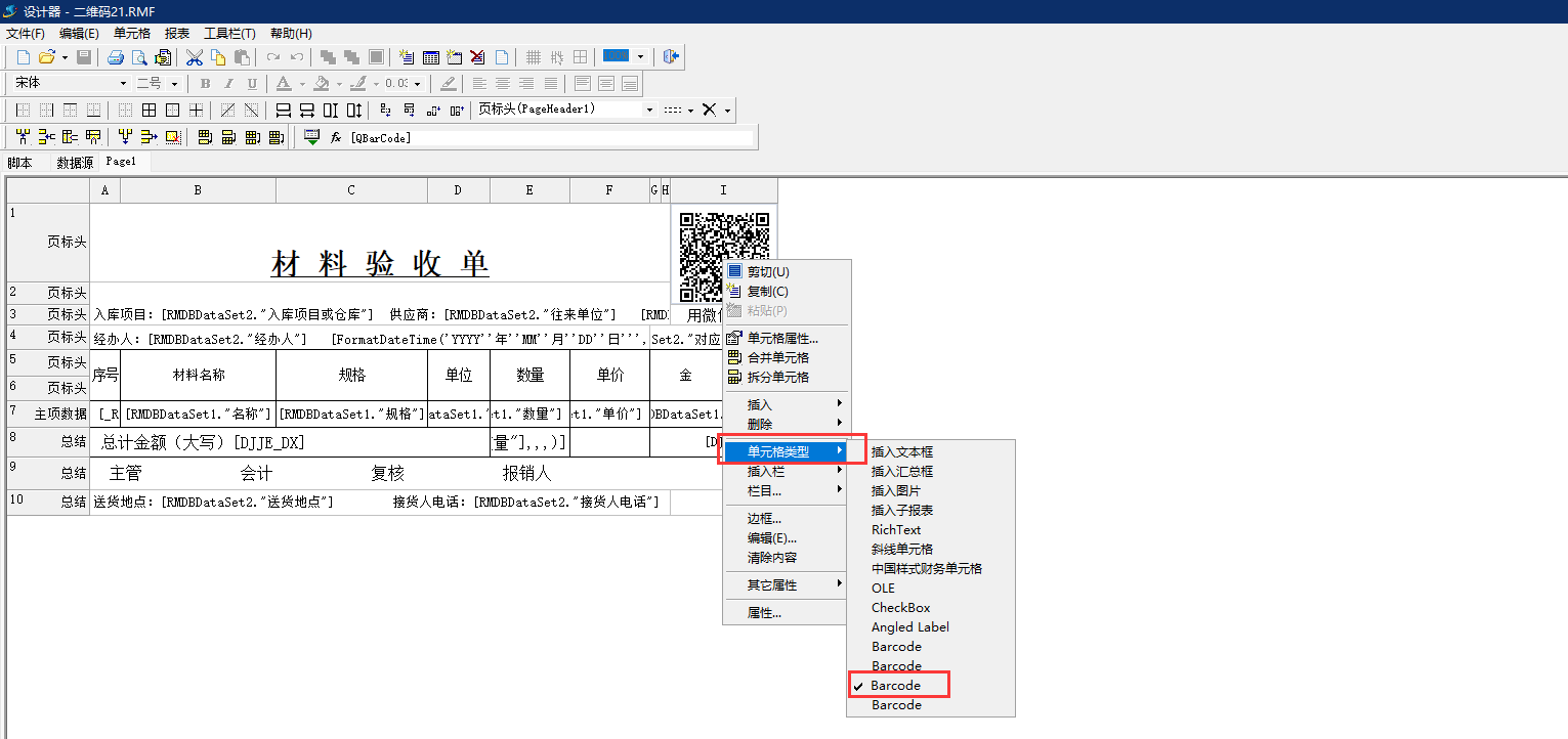 2、設置二維碼顯示位置及數據源。根據報表選定二維碼顯示位置,右鍵點擊單元格,選擇單元格類型為Barcode,如圖: