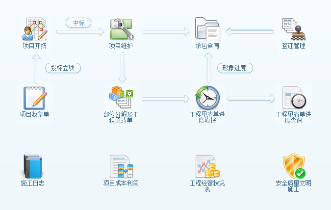 模塊包括目標和計劃管理、業務流程和控制、成本管理和控制、績效統計和評估。關鍵體現:合同信息管理、競爭對手管理、客戶信息管理、目標計劃管理、項目結算管理、績效考核管理。