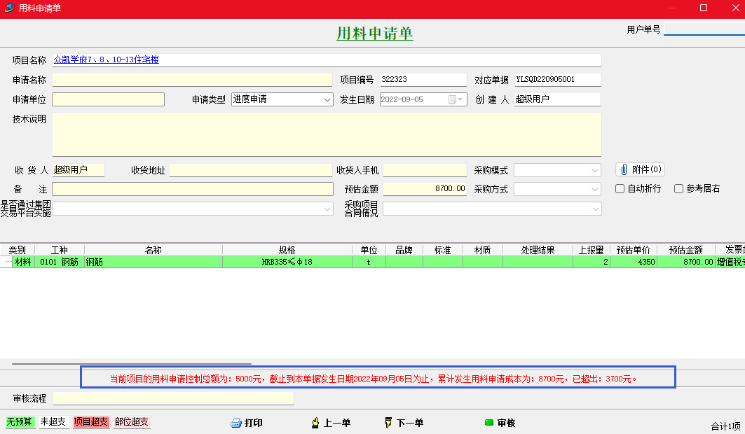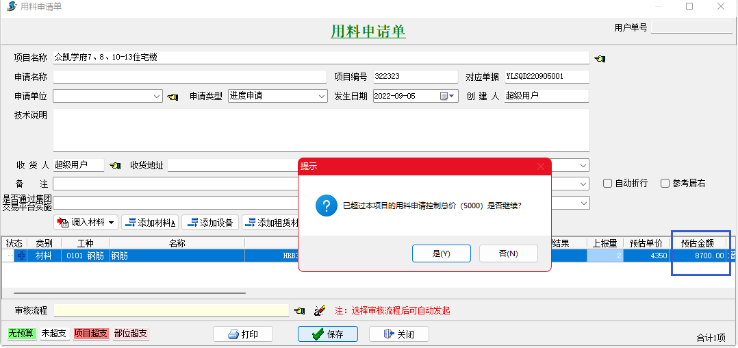 保存用料申請單超出控制金額會自動提示。