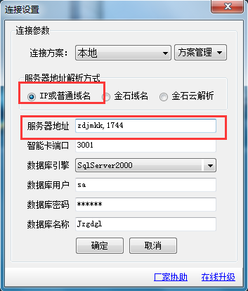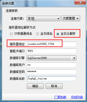 在做連接設(shè)置時(shí)直接選擇使用IP或計(jì)算機(jī)名稱,不要選擇金石云解析。如下圖是金萬(wàn)維解析: