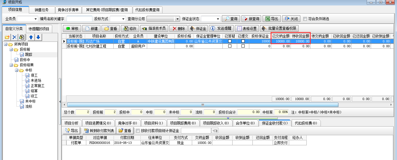 保證金收回,工程管理軟件的項目開拓中會顯示“已收回金額”為收款金額,待收回金額會減去已收回金額,“保證金”收付款中會有對應的收款記錄,如圖: