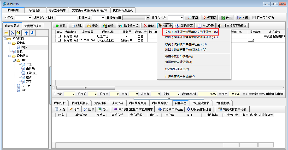 在工程管理軟件項目開拓列表中可以查詢多個項目投標保證金的九項合計,如圖所示:也可根據投標方式、業務員、項目狀態查詢。