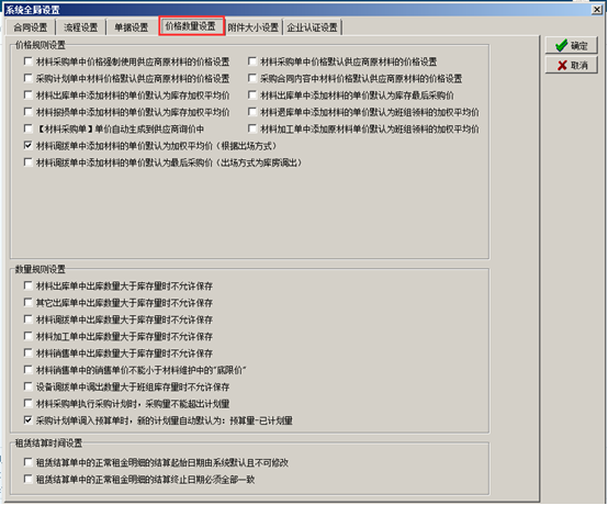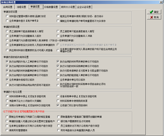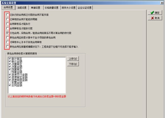 進(jìn)入系統(tǒng)的“系統(tǒng)維護(hù)”-“系統(tǒng)全局設(shè)置”彈出系統(tǒng)全局設(shè)置的對(duì)話框,點(diǎn)擊“合同設(shè)置”,在對(duì)應(yīng)的復(fù)選框打鉤代表合同受對(duì)應(yīng)開(kāi)關(guān)的控制,如圖:
