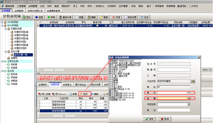 合同內(nèi)容修改則系統(tǒng)根據(jù)合同內(nèi)容的更改重新計算合同金額,如圖: