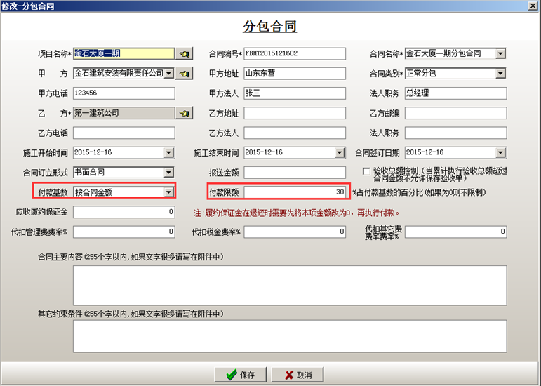 新建分包合同,在付款基數(shù)選擇“按合同金額”(統(tǒng)計成本是可按照合同金額統(tǒng)計成本),并輸入付款限額。如圖所示: