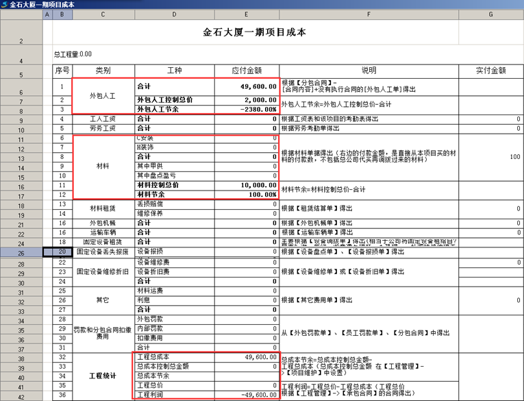 成本設(shè)置完成之后按照合同內(nèi)容查詢項目成本,系統(tǒng)可將對應(yīng)成本的控制總價與對應(yīng)成本節(jié)余生成對比。如圖所示: