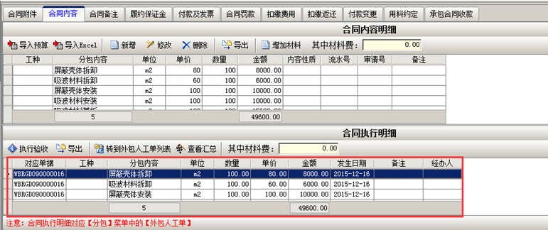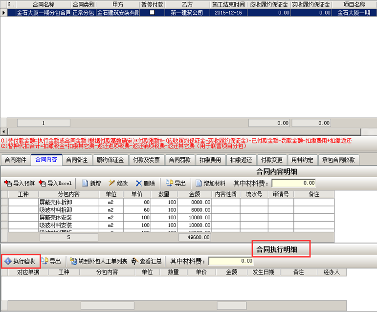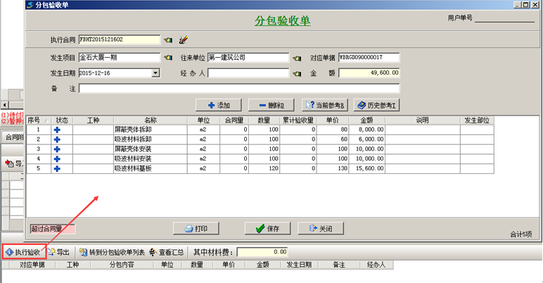 在【合同執(zhí)行明細(xì)】中點(diǎn)【執(zhí)行驗收】,生成【分包驗收單】。