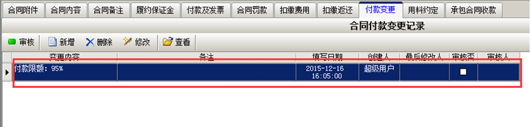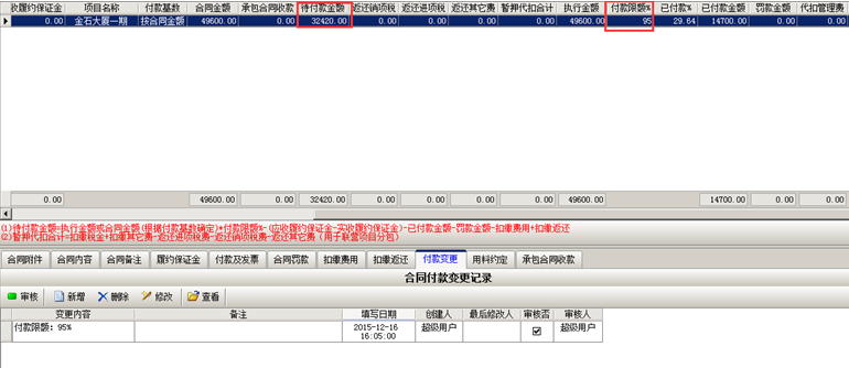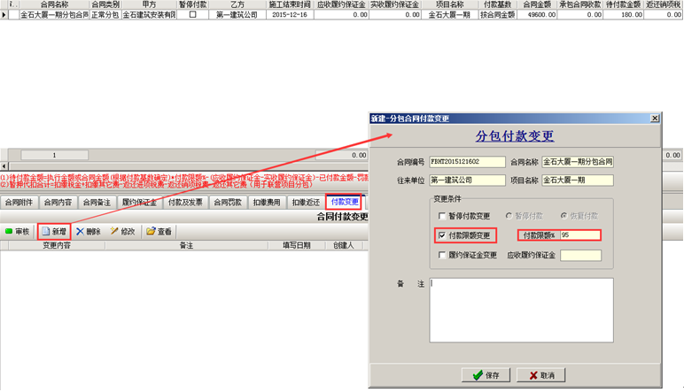 一般合同驗收完成之后,按照合同條款支付到95%,此時添加“付款變更單”,如圖所示: