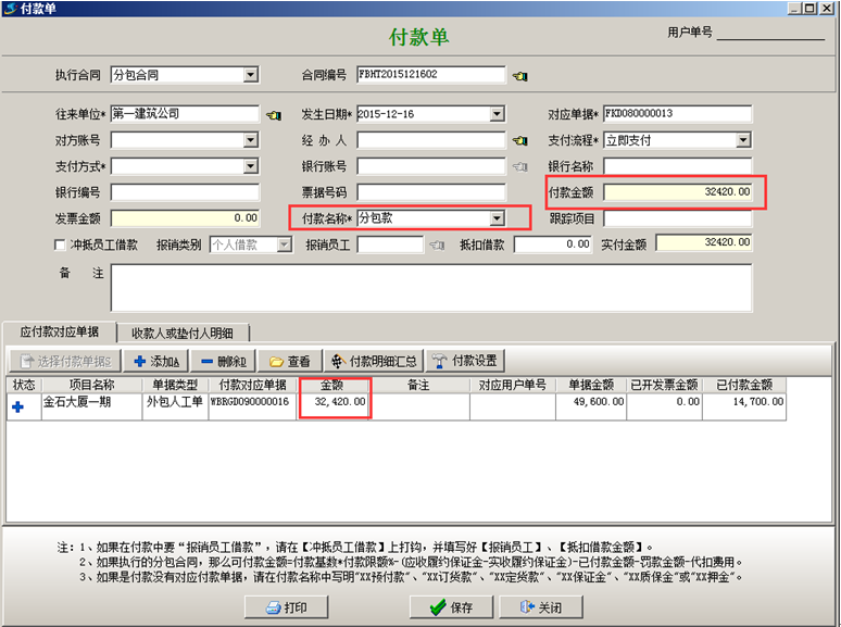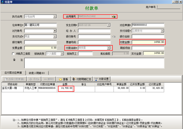 添加“付款單”,付款名稱為“預(yù)付款”、對應(yīng)好合同編號、輸入付款金額,如圖所示:
