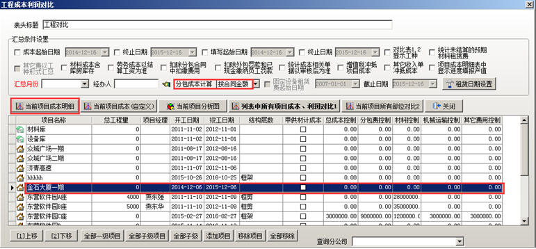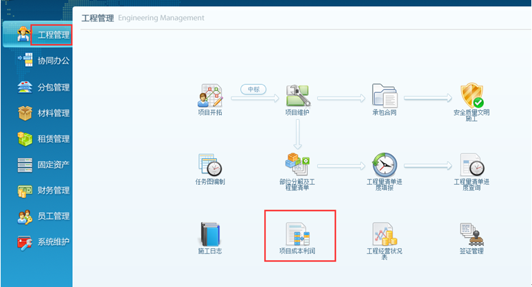 在“工程管理”-“項目成本利潤”中進(jìn)行項目成本利潤的查詢。如圖: