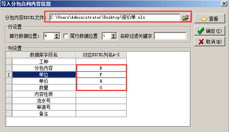 內(nèi)容與各列名對應(yīng)好之后點(diǎn)擊確定合同內(nèi)容導(dǎo)入系統(tǒng)中。注:導(dǎo)入的分包內(nèi)容要連續(xù),如果有分段分組現(xiàn)象,要先手工刪除,再執(zhí)行導(dǎo)入!