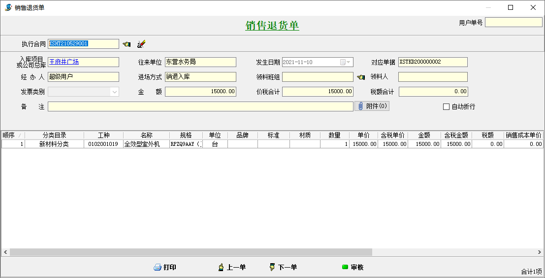 金石工程管理軟件新增:銷售退貨單