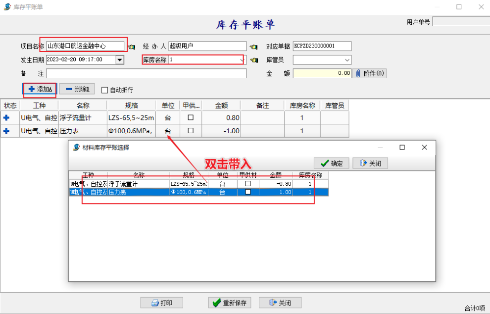 材料管理中新增【庫存平賬單】。【庫存平賬單】用來對庫存中結余數量為0但結存金額不為0的數據做平賬處理,即把金額歸零。如下圖所示,結存金額為非零數據,