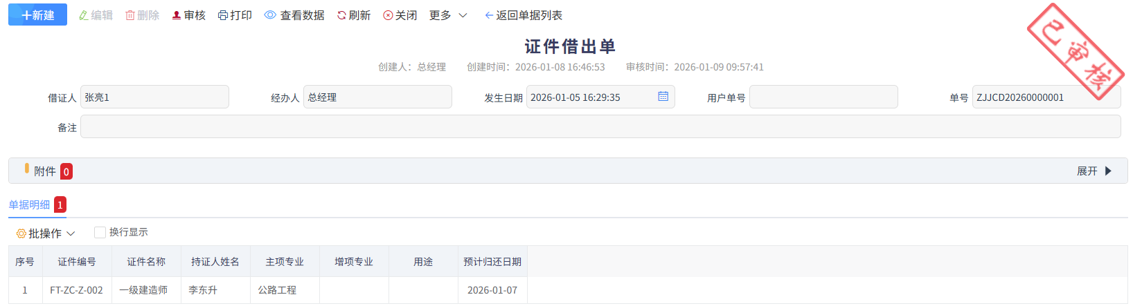 證件歸還時(shí),做證件歸還單,如下圖所示,
