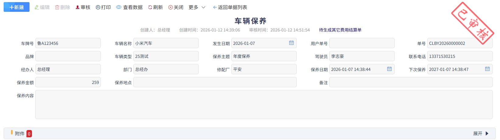 車輛保養(yǎng)的相關費用,輸入保養(yǎng)金額中,審核完成后,點擊更多中的生成其它費用結算單進入進入報銷流程,如下圖所示
