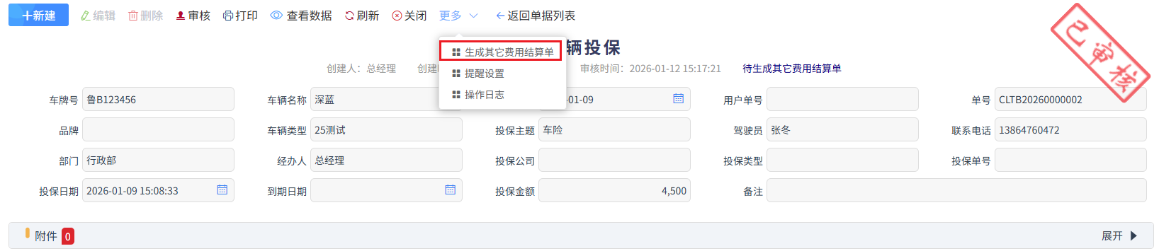 投保金額為車險金額,審核完后,點擊更多下的生成其它費用結算單走付款申請流程,一般公司的車對公支付車險,不走報銷流程,如下圖所示