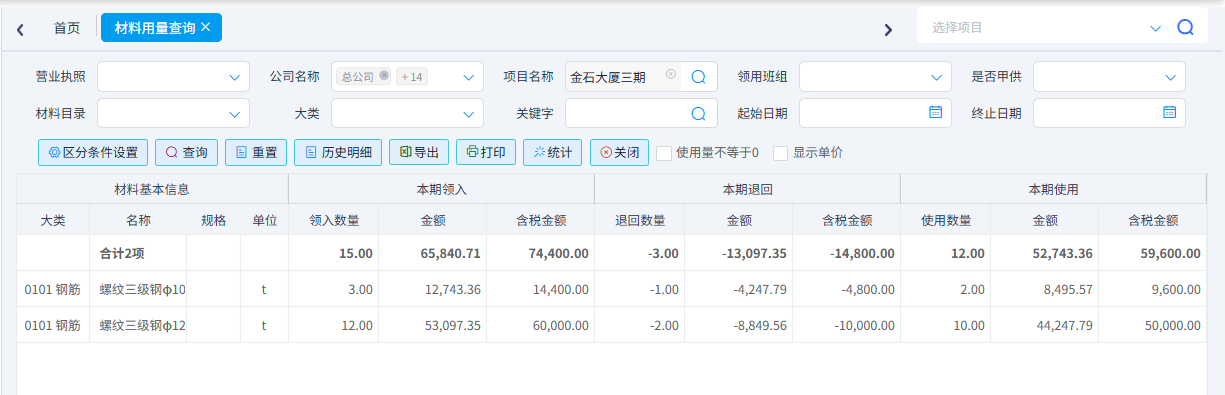 是用于查詢工地材料用量。可以按照營業執照、公司、項目、班組、材料名稱、時間等篩選材料用量信息