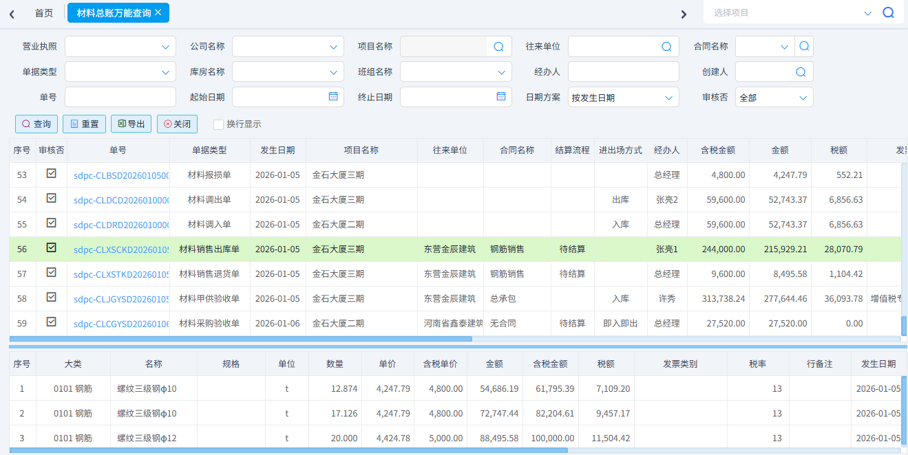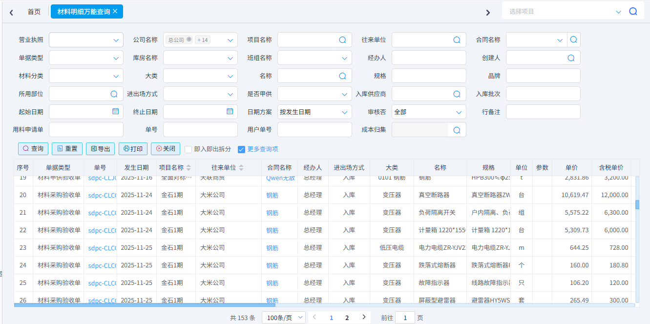 用于查詢所有類型的材料單據的內容明細。該功能可滿足關于材料明細的任何形式任何條件的查詢。可以按照單據類型、項目名稱、供應商、材料名稱、時間等條件進行篩選。可以導出Excel表格。