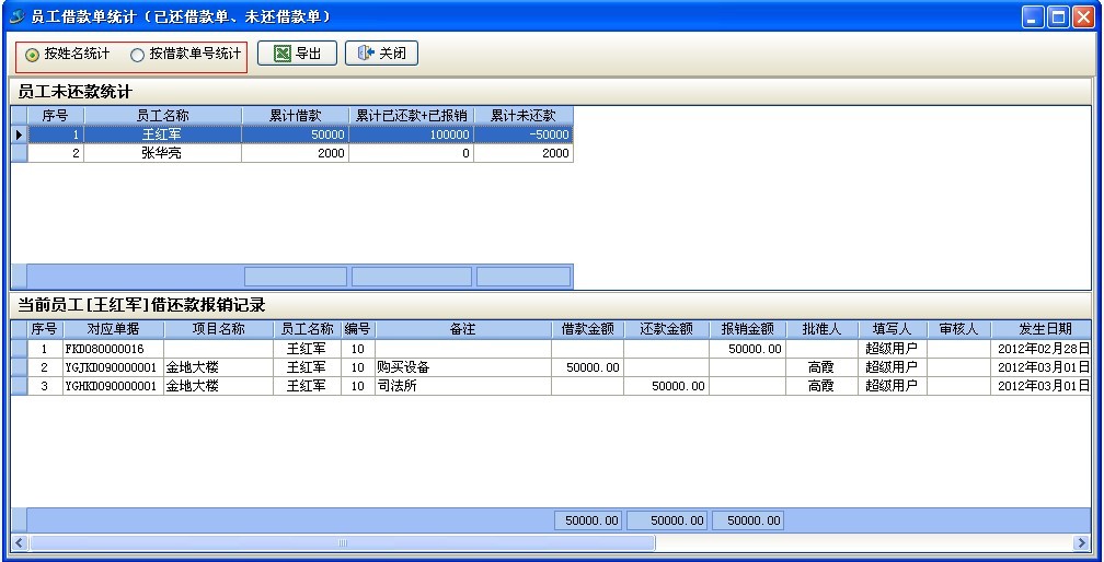 在【員工借款單統計】選擇按姓名統計或按借款單號統計,可查到員工的借還款情況(包括未還借款列表、已還借款列表)。如下圖: