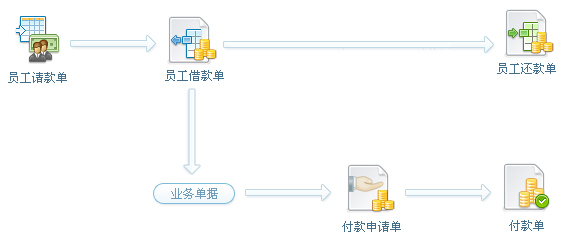 【付款申請單】, 付款申請單審核通過后,填寫【付款單】在付款單中選擇【沖抵員工借款(報銷借款)】。填寫【員工還款單】。