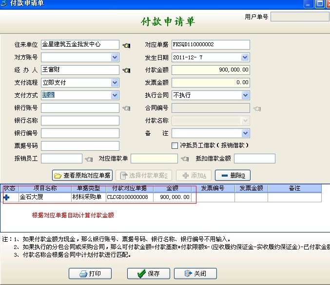 金石工程項目管理軟件的操作流程:首先根據【業務單據】中付款金額填寫【付款申請單】,付款申請單審核通過后,再來填寫【付款單】。