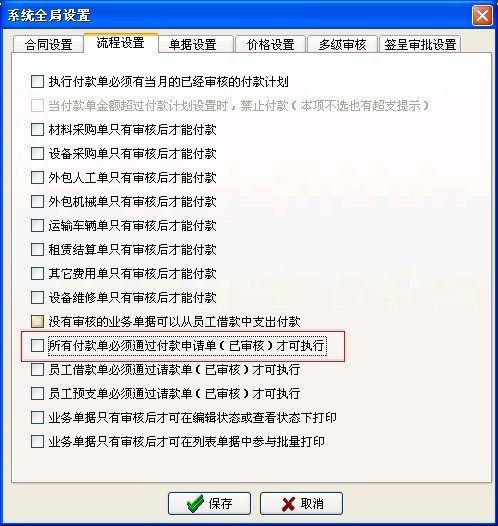 注:當【系統全局設置】—【流程設置】中【所有付款單必須通過付款申請單(已審核)才可以執行】開關未打開時,