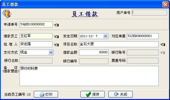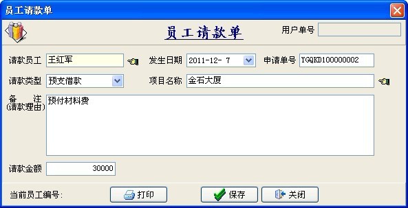 軟件的操作流程:首先填寫【員工請款單】—通過各級審核后填寫【員工借款單】,當員工需要報銷時,填寫相關【業務單據】根據業務單據填寫