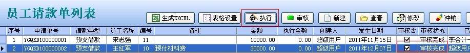在【員工請款單列表】中選擇已審核完成的單據,點【執行】按鈕即可彈出【員工借款單】。