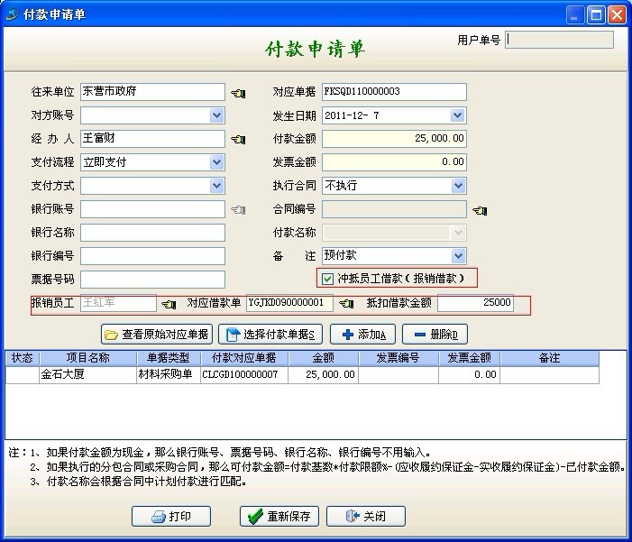2. 填寫好【相關業務單據】后根據單據,填寫【付款申請單】。在【付款申請單中】選擇【沖抵員工借款(報銷借款)】。