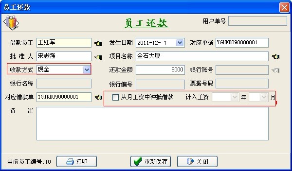 3. 填寫【員工還款單】,可選擇現金或從月工資中沖抵借款。如下圖: