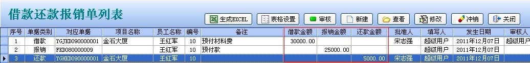 【借還款報銷單列表】如下:其中借款金額30000、報銷金額25000、還款金額5000。