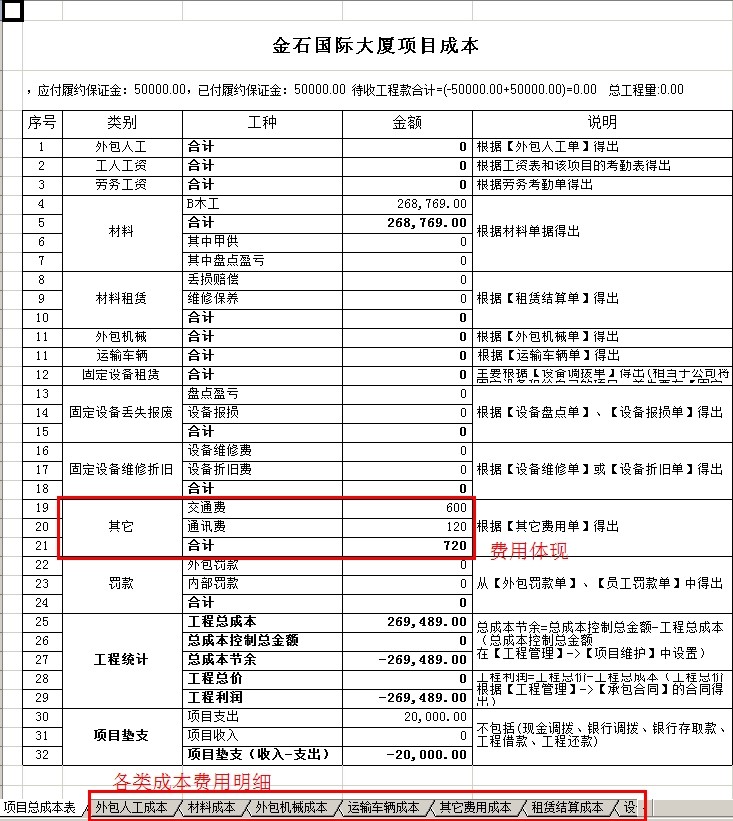 彈出項(xiàng)目成本利潤表,可以查看該項(xiàng)目的其他費(fèi)用項(xiàng)目,是否有顯示之前錄入的費(fèi)用。其他的類別隨著工程的進(jìn)度中,錄入相應(yīng)的單據(jù),會(huì)產(chǎn)生其對應(yīng)的成本費(fèi)用。