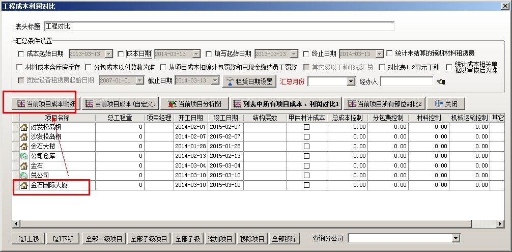 打開項(xiàng)目成本利潤,選擇要查詢的項(xiàng)目,點(diǎn)擊當(dāng)前項(xiàng)目成本明細(xì)(也可以在系統(tǒng)全局設(shè)置中自定義項(xiàng)目成本利潤表,在查看成本利潤的時(shí)候,選擇第二項(xiàng),當(dāng)前項(xiàng)目成本(自定義))